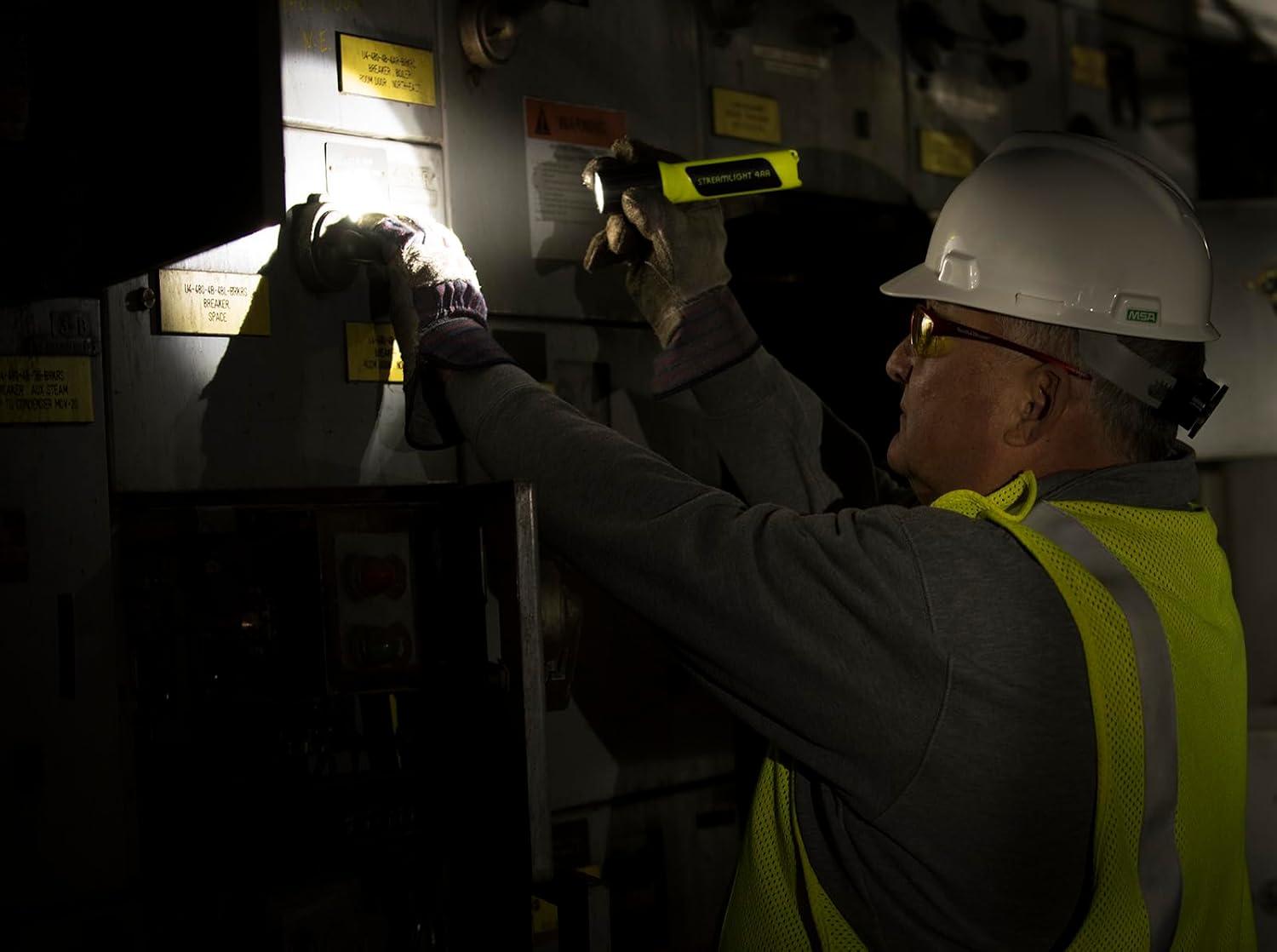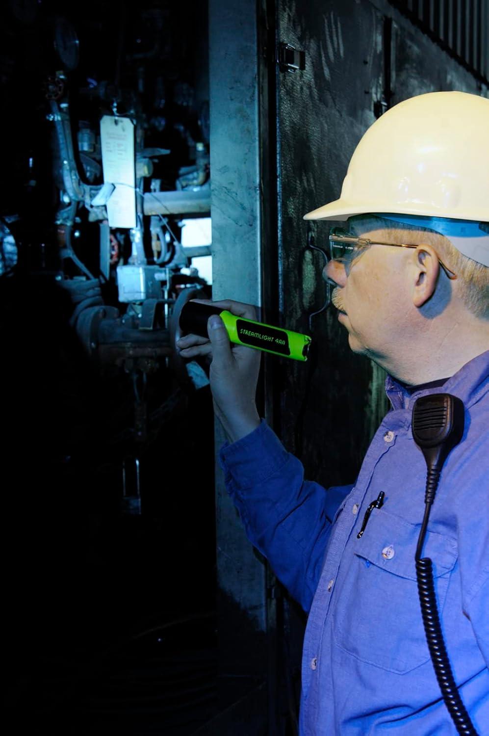 The Streamlight ProPolymer 4AA Luxeon Division 2 Flashlight is tough, lightweight, affordable, alkaline battery-powered personal flashlight. This impact and shock resistant Luxeon flashlight runs 4 hours at full intensity with 2 additional hours of declining usable light on 4 AA alkaline batteries (included). It is waterproof, non-conductive and corrosion proof. The 1 watt, 10,000 hour, super high-flux LED provides a longer reaching, brighter beam that's 10 times brighter than a high-intensity LED, up to 3,500 peak beam candlepower (42 lumens). The Streamlight ProPolymer 4AA Luxeon Division 2 Flashlight features virtually indestructible polymer with a scratch-resistant face-cap and an unbreakable polycarbonate lens. It is also remarkably comfortable to use because it is ergonomically shaped for your hand and offers push-button switching for one-handed operation. Streamlight ProPolymer 4AA Luxeon Div 2 Flashlights offers a wrist lanyard connection. It is 7-inches in length and weighs 7.52 ounces. Available in yellow and black. Permissible for use in Gassy Mines, Methane/air only. Appr. No. 10C-658-0. Approved for use in hazardous locations. UL listed for Class I, Division 1,Groups C, D; Class I, Division 2, Groups A, B, C, D; Class II, Division 2, Group FandG; Class III, T3C. Canadian UL listed for Class I, Division 2, Groups A, B, C, D; Class II, Division 2, Group FandG; Class III, T3C.