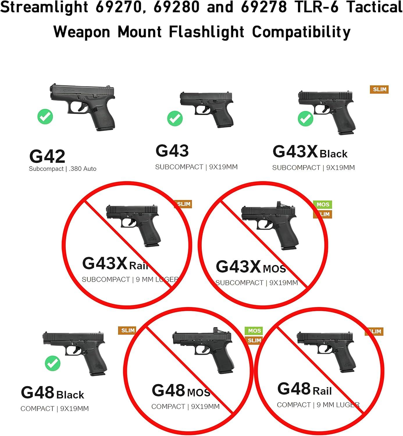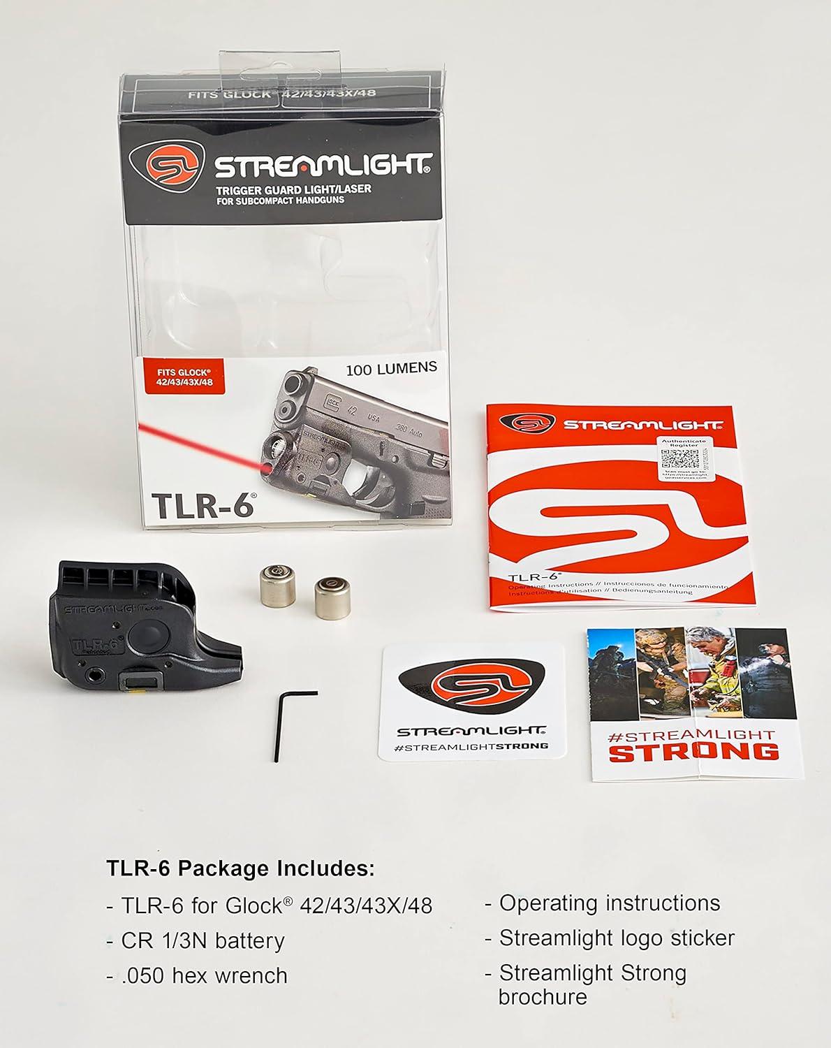 Engineered specifically for Glock slimline pistols, the Streamlight 69270 TLR-6 fits Glock 42, Glock 43, Glock 43X, and Glock 48 only, delivering a precise fit that won’t add bulk to concealed carry. Its 100-Lumen LED produces a bright, focused beam for positive ID in low light, while the integrated red aiming laser speeds target acquisition at defensive distances. Purpose-built for the trigger-guard profile of these models, the TLR-6 remains ultra-compact (approx. 2.3” L × 0.85” W × 1.4” H) and lightweight (~1.27 Ounce with batteries) so your Glock balances naturally. Rugged, impact-resistant construction stands up to daily carry and repeated recoil, and the intuitive switch allows light only / laser only / light + laser modes to match your environment. If you’re searching for a Streamlight TLR-6 for Glock 42/43/43X/48, the 69270 combines exact-fit compatibility, bright 100-Lumen output, and true subcompact sizing for confident carry and control.