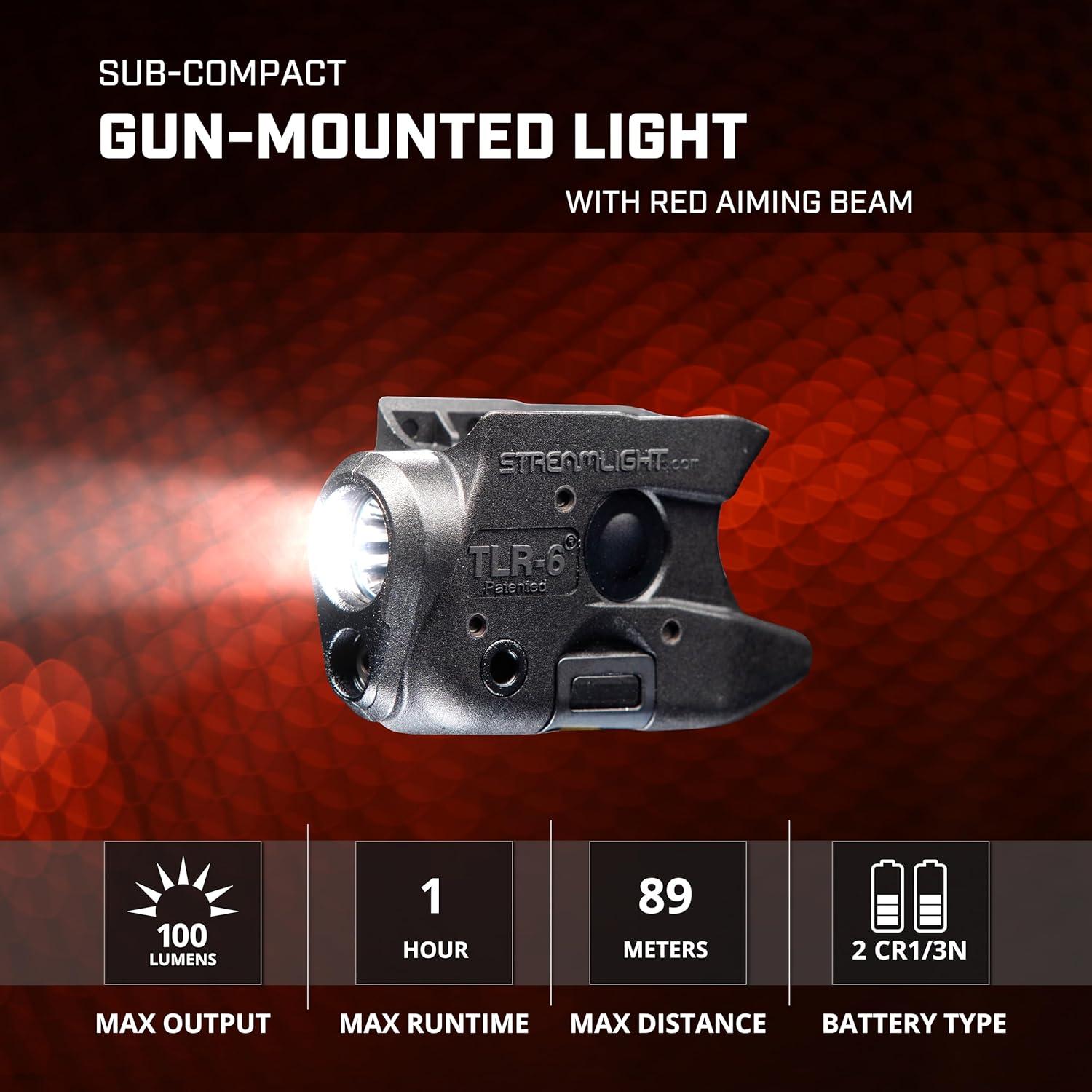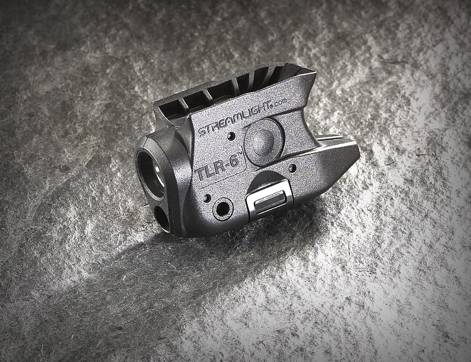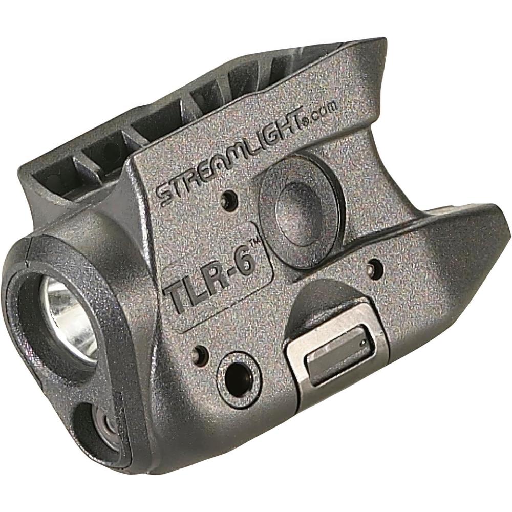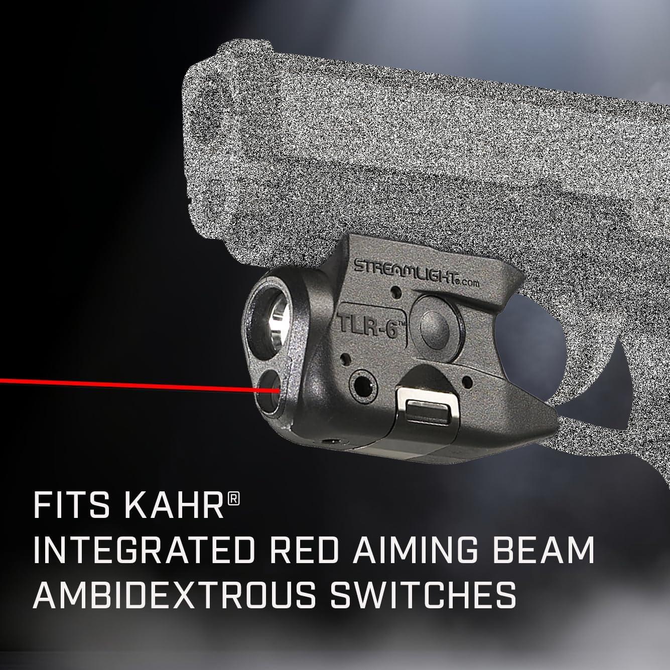 The ultra-compact TLR-6 weapon light with bright white light and integrated red aiming beam features tool-less battery replacement without removal from the weapon or the need to re-sight the beam. Securely attaches to the trigger guard of the rail on hand guns. Designed for use with Kahr Arms subcompact handguns.