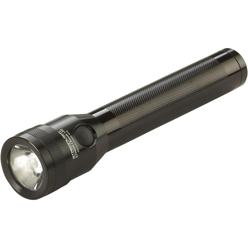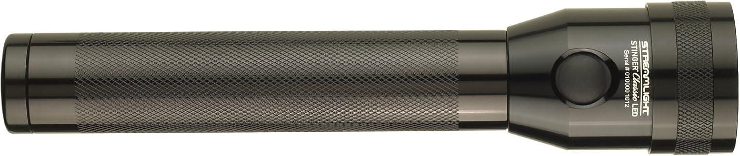 Streamlight 75666 Stinger Classic LED Rechargeable Flashlight with 120-Volt AC/DC PiggyBack Holder (NiCd) Charger. The Stinger Classic LED was designed to replicate the size, shape and feel of the original xenon Stinger model enhanced with C4 LED technology for intense brightness. Custom optic design provides a smooth beam with optimal peripheral illumination. Optimized electronics provide regulated intensity throughout battery charge. Three modes and strobe: High for a super-bright and far-reaching beam; Medium for bright light and longer run times; Low for light without glare and extended run times; Strobe for disorienting or signaling your location. Anodized aluminum construction with knurled barrel for a sure grip. IPX4 water-resistant; 1-meter impact resistance tested. 3-cell, 3.6 Volt Ni-Cd sub-C battery, rechargeable up to 1000 times. Length: 7.65-inch (19.43 cm); Weight: 11.1-ounce (315g).