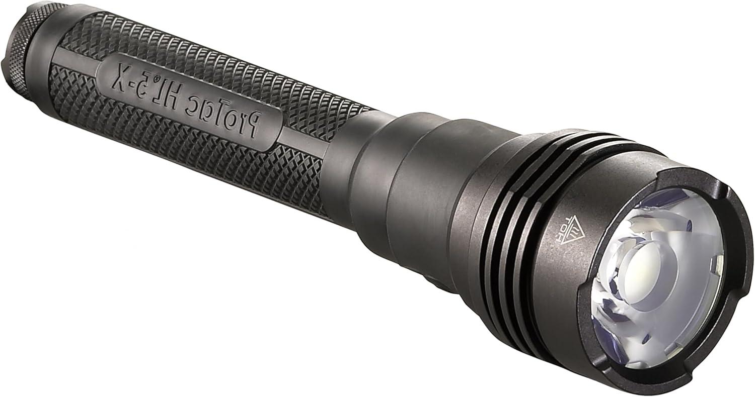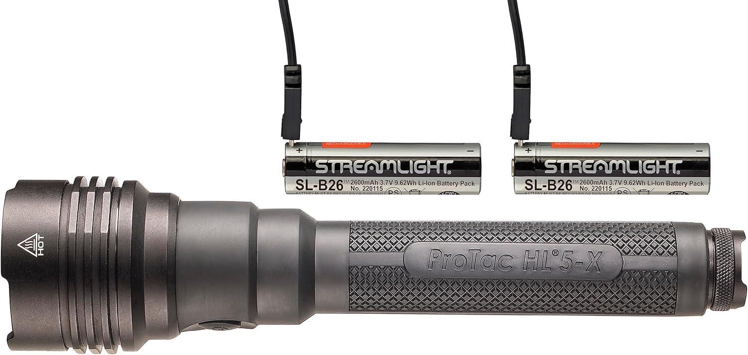 The super bright 3,500-lumen full-size Streamlight ProTac HL 5-X USB flashlight is a complete rechargeable flashlight system with a charge cord and two SL-B26 rechargeable battery packs that feature integrated micro-USB charge ports. The ProTac HL 5-X USB is the brightest addition to the ProTac series, offering the latest in power LED technology and three different user-selectable programs. The output from the LED results in one of the brightest tactical lights available. It also accepts four CR123A lithium batteries (sold separately). Features TEN-TAP Programming – Choice of three user-selectable programs: 1) high/strobe/low 2) high only 3) low/medium/high; High (SL-B26 battery packs). The ProTac HL 5-X USB is IPX7 waterproof to 1 meter for 30 minutes; 1-meter impact resistance teste. It features a durable, anodized aluminum construction and the anti-roll head prevents the light from rolling away when placed on a flat surface. The rubber sleeve provides thermal insulation and a sure grip. Whether you’re on duty, on the go, or need to shine light in the dark, the Streamlight ProTac HL 5-X USB is designed for whatever situations or adventures that come your way.