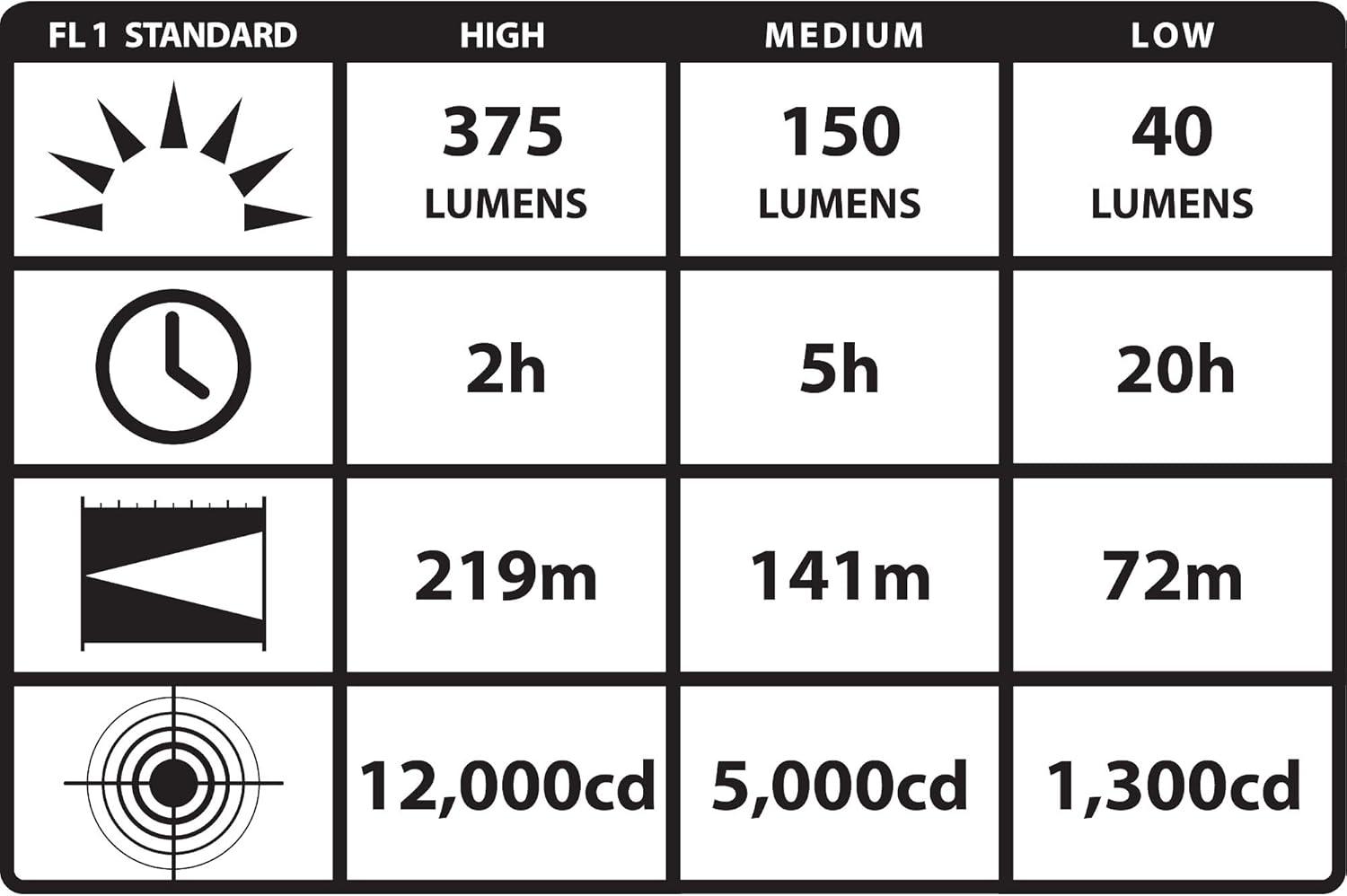 High for a bright super-bright beam: 375 Lumens; 12, 000 candela; 219M beam distance; runs 2 hours