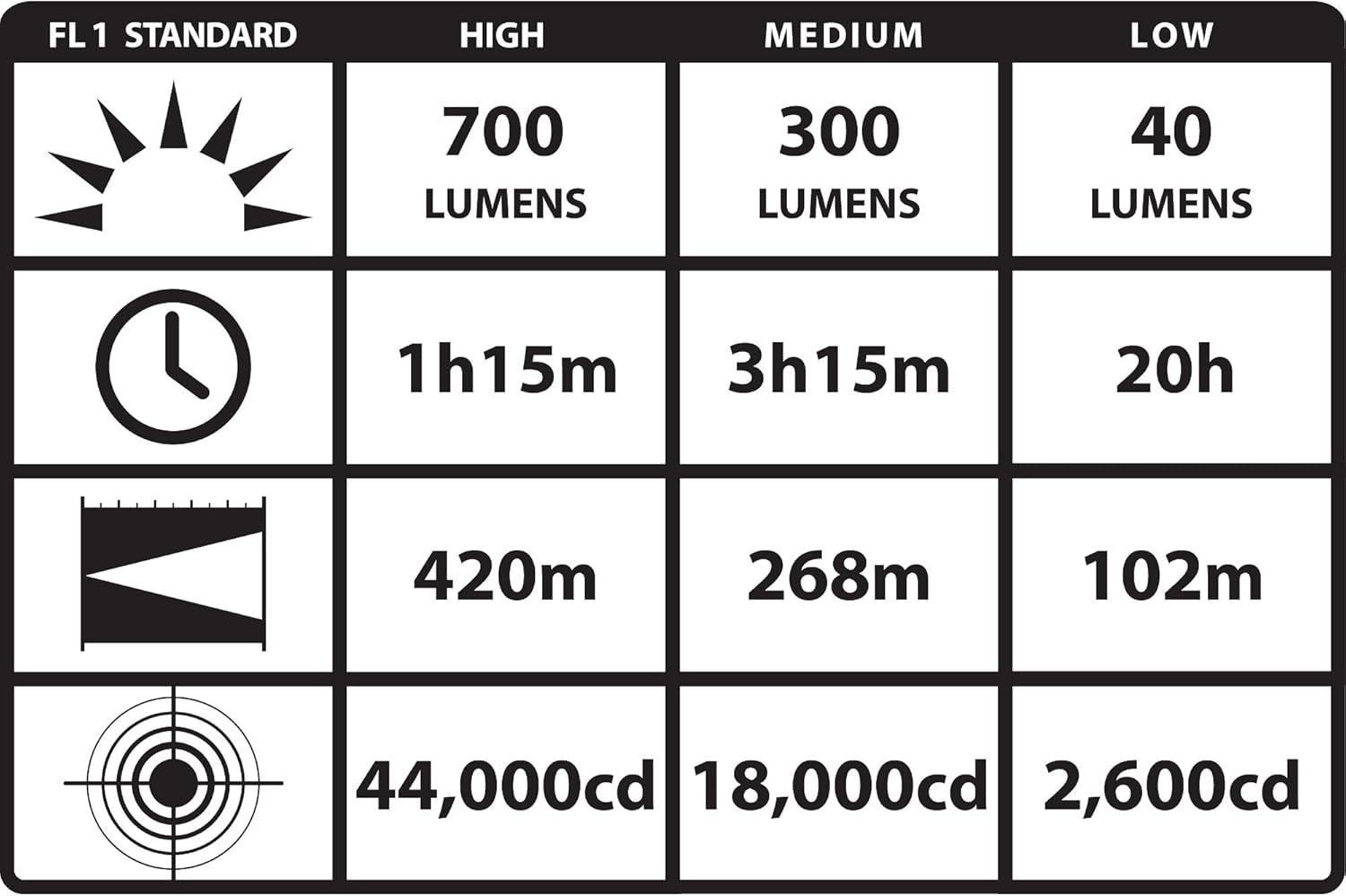 High for a far-reaching beam with maximum illumination: 700 Lumens; 420M beam; 44,000 Candela; runs 1.25 hours